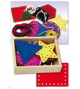 Pomôcka na precvičovanie jemnej motoriky a koordinacie ruka - oko. Obsahuje 8 ks rôznofarebných foriem a 10 šnúrok.