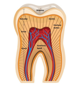 Prečo je zub biely? Prečo ťa niekedy bolí? Dvojdielny model je na jednej strane popísaný názvami hlavných častí zuba....