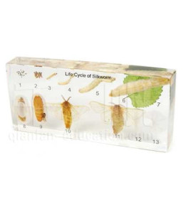 Model znázorňujúci vývoj priadky morušovej od vajíčka po dospelého jedinca, akrylátový hranol, rozmer: 164x78x20 mm.