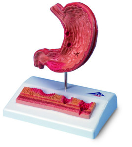 Model znázorňuje rôzne štádiá gastritídy od ľahkého žalúdočného vredu až po perforáciu s detailom povrchu...