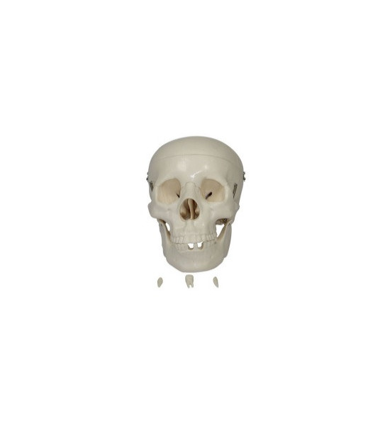 Model lebky v životnej veľkosti. Obsahuje pohyblivú sánku, prierez - kalvárium, pre pohľad dovnútra, švy a tri vyberateľné zuby - rezák, očný zub a stoličku.Rozložiteľná na 3 časti.