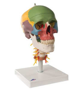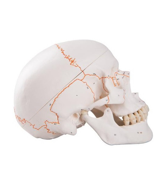 Očíslovaná replika ľudskej lebky so švami lebky vo farebnom prevedení. Vysokokvalitné originálne časti. Lebka je ručne vyrobená z tvrdého nezlomiteľného plastu. Vysoko presná reprezentácia puklín, perforácie, procesov, švov atď. Môže byť rozdelená na temeno lebky, spodok lebky a čeľusť. Ako alternatívu, možno do lebky vložiť 5 dielny mozog. Model je skvelý nástroj na vyučovanie anatómie lebky.