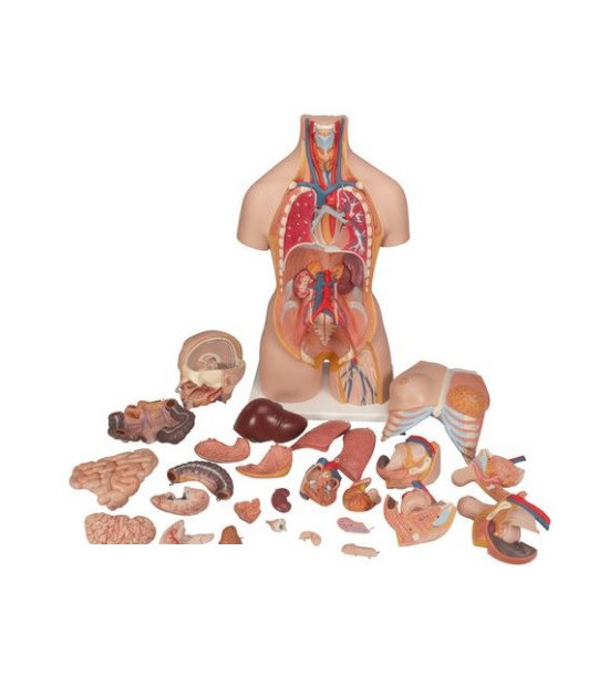 28-dielne torzo s oddeliteľnou hlavou (na jednej strane znázornená lebka s mozgom), 2 pľúcne laloky, srdce (2 časti), žalúdok (2 časti), pečeň so žlčníkom, kompletný črevný trakt (4 časti), srdce (2 časti), ženská hrudná stena, predná polovica obličiek, mužské genitálie (4 časti), ženské genitálie s plodom (3 časti). Otvorené krčné a chbtové časti : stavce, medzistavcové disky, miecha, chrbtica, vertebrálne tepny. Rozmery: 87x38x25 cm. Hmotnosť: cca 9 kg.