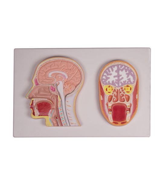 Frontálny (čelný) a mediálny (stredový) prierez ľudskou hlavou zobrazuje povrchové a vnútorné štruktúry hlavy. Porovnanie oboch prierezov umožňuje pochopenie anatomickej stavby hlavy. Reliéfny model na doske. Veľkosť: 55 x 35 x 3 cm, hmotnosť 2 kg. Vďaka aplikácii Augmented Anatomy (verzia EN, DE) v kombinácii s týmto kvalitným anatomickým modelom je učenie jednoduchšie a efektívnejšie. Aplikácia automaticky rozpoznáva anatomické modely EZ a zobrazuje nomenklatúru v rozšírenej realite. Aplikácia rozšírenej anatómie funguje na všetkých bežných smartfónoch alebo tabletoch.