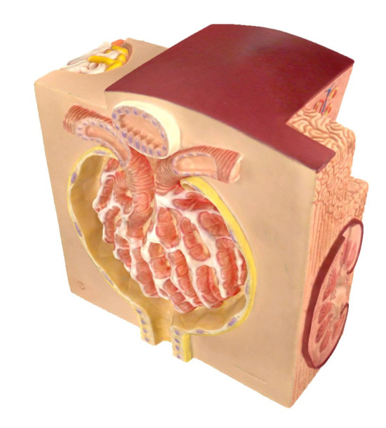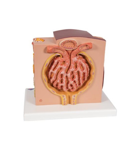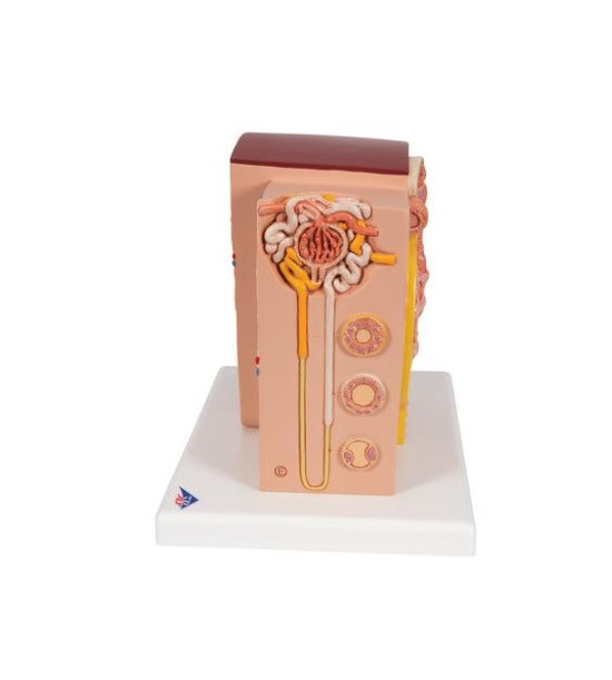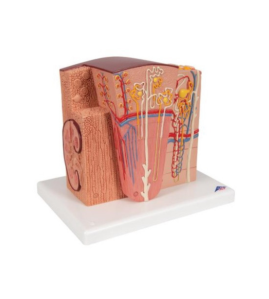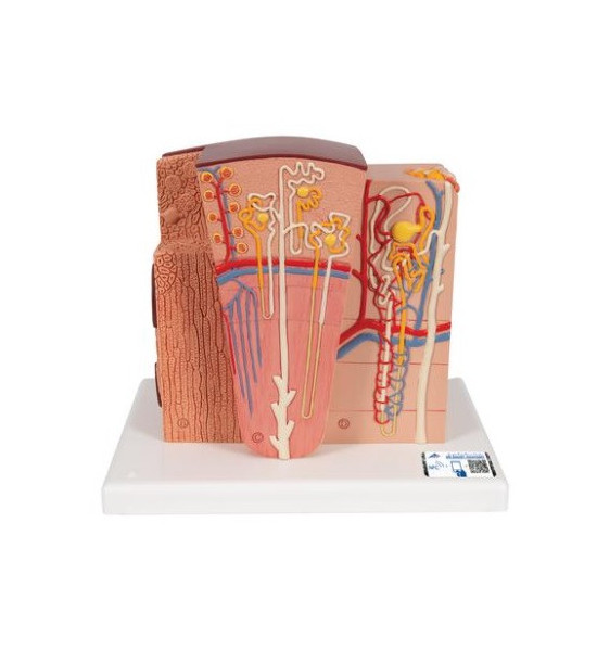 Model mikroskopickej štruktúry obličiek. 3B MICROanatomy™ je mimoriadne podrobný model, ktorý zobrazuje morfologické/funkčné jednotky obličiek. Štruktúry obličiek sú zväčšené. Šesť modelových zón ilustruje štruktúry ľudskej obličky, ktoré slúžia na filtráciu a tvorbu moču. Rozmery: 23,5 x 25,5 x 19 cm, hmotnosť cca 0,95 kg. Pozdĺžny rez obličkou. Rez obličkovej kôry a obličkovej drene obličky . Klinovitý rez obličkovým lalokom so schematickým zobrazením troch nefrónov s Henleovými slučkami rôznej dĺžky a schematickým zobrazením cievneho zásobenia. Schematické znázornenie obličkového nefrónu s krátkou Henleovou slučkou a didaktickou ilustráciou cievneho zásobenia. Schematické znázornenie otvoreného obličkového telieska s nefrónom a mikroskopickými prierezmi proximálneho, oslabeného a distálneho segmentu obličkového tubulu. Schematické znázornenie otvoreného obličkového telieska obličky. Naskenujte QR kód umiestnený na vašom anatomickom modeli, stiahnite si novú aplikáciu 3B Smart Anatomy a vstúpte do virtuálneho sveta ľudskej anatómie.