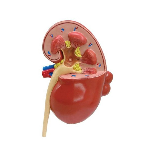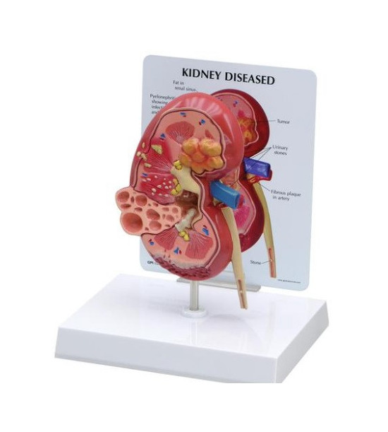 Model ľudskej obličky s ochorením. Model na podstavci. Tento nadrozmerný obojstranný model obličky má na jednej strane anatomický prierez normálnej obličky a na druhej strane anatomický prierez obličky s ochorením: infekciu, zjazvenie, atrofiu, močové (obličkové) kamene, nádor, polycystické ochorenie, účinky hypertenzie.Rozmery modelu: oblička cca 9,5 x 6,3 x 16,5cm, podstavec cca 16,5 x 12,7 cm. Hmotnosť: 0,4 kg.
