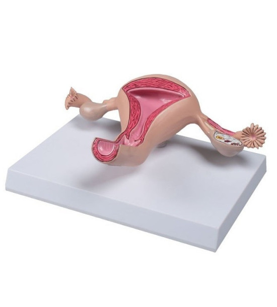 Model zdravej maternice v životnej veľkosti. Anatómia je detailne zobrazená, vnútorné štruktúry sú maľované ručne. Cervix, endocervikálny kanál, maternicová dutina odkrytá pre zobrazenie vnútornej výstelky maternice endometrium a vrstva hladkej svaloviny myomtérium. Odkrytá je aj štruktúra vajíčkovodu a vaječníka, zobrazené sú folikuly a ookinéza. Na odnímateľnom stojane. Veľkosť modelu: 23 x 16 x 6 cm, hmotnosť: 0,5 kg