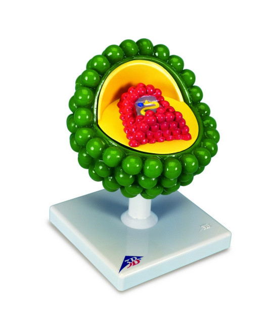 HIV je vírus, ktorý je pôvodcom ochorenia AIDS, spôsobuje zlyhanie imunitného systému napadnutého organizmu. Model HIV-vírusu je viac ako miliónkrát zväčšený a znázorňuje vonkajšiu lipidovú membránu s proteínovými štruktúrami a vnútorné jadro, ktoré obsahuje vírusovú dedičnú RNA. Jadro je vyberateľné. Model je umiestnený na podstavci. Rozmery: 18x13x13 cm. Hmotnosť: 0,7 kg.