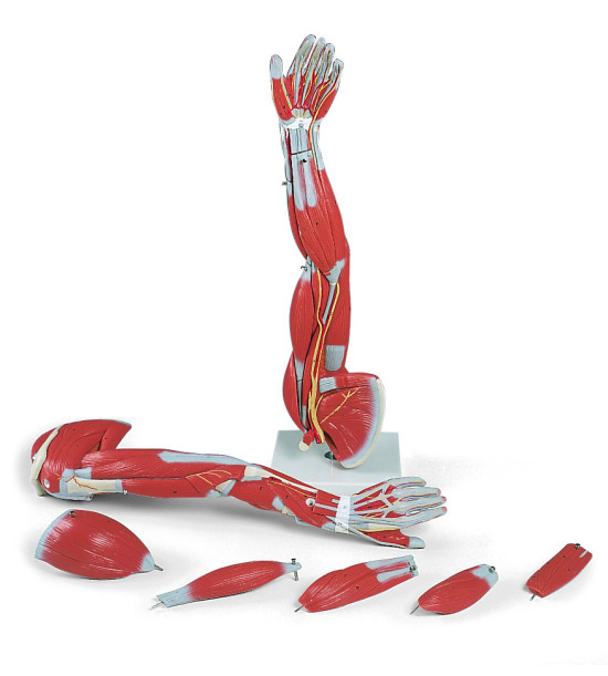 Model svalov ruky znázorňuje povrchové a hlbšie svaly, päť z nich je odnímateľných od ostatných svalov ruky. Šľachy, cievy, nervy a kosti ľavej ruky a ramená sú na modeli detailne zobrazené. Časti sú číslované. Rozmery: 60x18x18 cm, hmotnosť: 1,9 kg.