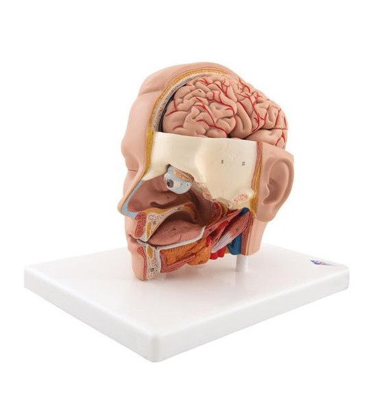 Veľmi podrobný model hlavy v životnej veľkosti, zložený zo šiestich častí, odhaľuje a umožňuje odnímať mozog s artériami a očnú buľvu s optickým nervom. Odkrytá je nosová dutina. Model dodávaný na odnímateľnej základni. Rozmery: 19x22x22 cm. Hmotnosť: 1 kg.
