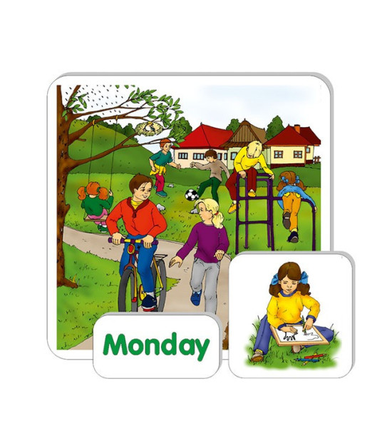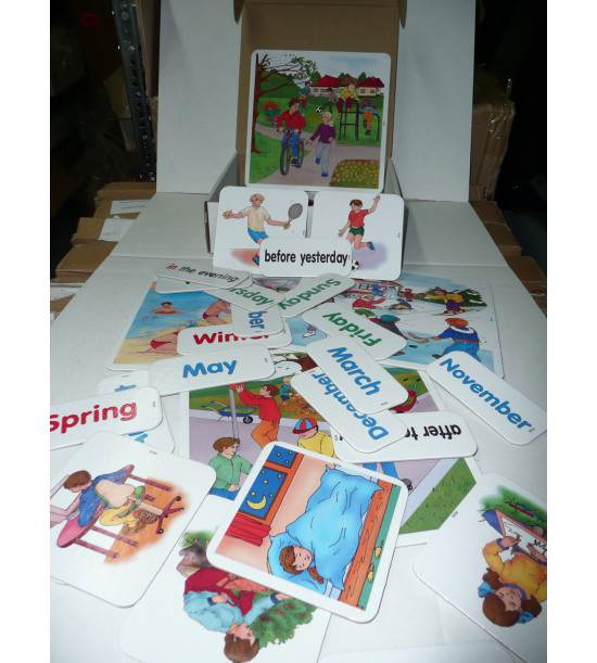 Súbor obrázkov a textových kartičiek umožňuje nácvik, precvičovanie a upevňovanie slovnej zásoby, tvorenie viet a dialógov k téme Čas II - AJ. Obsah: 4ks magnetické ilustrované obrázky / 18 x 18cm / pevný kartón 2mm 11ks magnetické ilustrované obrázky / 9 x 9cm / pevný kartón 2mm 39ks magnetické textové kartičky / 9 x 4,5cm / pevný kartón 2mm Kartónová krabica.