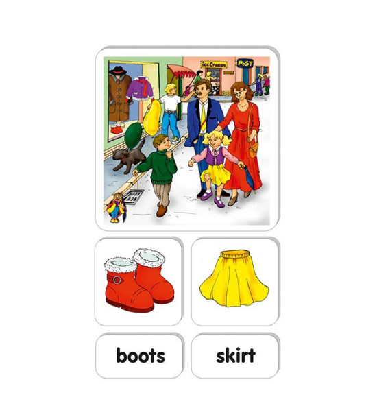 Súbor obrázkov a textových kartičiek umožňuje nácvik, precvičovanie a upevňovanie slovnej zásoby, tvorenie viet a dialógov k téme Oblečenie - AJ. Obsah: 1ks magnetické ilustrované obrázky / 18 x 18cm / pevný kartón 2mm 20ks magnetické ilustrované obrázky / 9 x 9cm / pevný kartón 2mm 24ks magnetické textové kartičky / 9 x 4,5cm / pevný kartón 2mm Kartónová krabica.