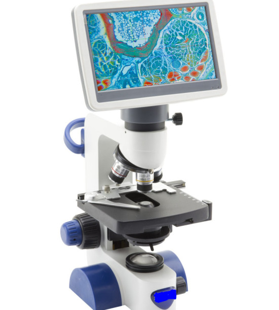 Učiteľský biologický mikroskop: Digitálny biologický mikroskop s LCD 7" obrazovkou s vysokým rozlíšením, 1920x1080 pixelov a 30 fps (video) a 1844x1080 pixelov (foto). Revolverový nosič s achromatickými objektívmi 4x, 10x a 40x. Hrubé a jemné zaostrovanie, Abbeho kondenzor 1,25 N.A kondenzor, vopred centrovaný, zaostriteľný s irisovou clonou. Mechanický stolík StagErase™, 125x125 mm s rozsahom pohybu XY 62x24 mm. Vernierova stupnica na 2 osiach s prenosťou 0,1 mm. Osvetlenie 1W LED s reguláciou jasu a teplotou farby 6 300 K - brightfield pozorovanie.