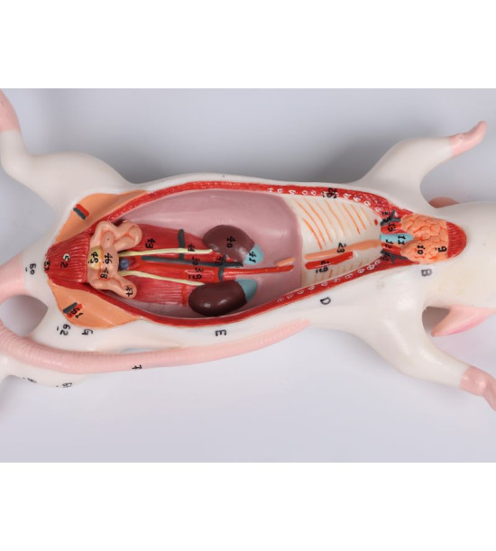 Tento model zobrazuje vnútornú anatómiu potkana a je určený na výučbu a nácvik disekčných postupov. Umožňuje študentom a odborníkom skúmať a rozpoznávať hlavné orgány a anatomické štruktúry, čo poskytuje lepšie pochopenie fyziológie a biológie hlodavcov. Model slúži ako cenná učebná pomôcka v oblasti biológie a veterinárnej anatómie.