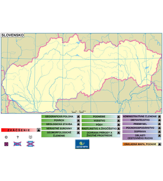 Formou interaktívnych máp a animácií približuje a poskytuje informácie o Slovenskej republike. Jednotlivé témy sú štrukturované v paneloch pričom zelené panely obsahujú informácie z fyzickej geografie a fialové panely z humánnej geografie. Témy z fyzickej geografie (zelené panely): Geografická poloha, Povrch, Geologická stavba, Nerastné suroviny, Geomorfologické členenie, Podnebie, Vodstvo, Pôdy, Rastlinstvo a živočíšstvo, Ochrana prírody a životného prostredia. Témy z humánnej geografie (fialové panely): Administratívne členenie, Obyvateľstvo, Priemysel, Poľnohospodárstvo, Doprava, Oblasti cestovného ruchu.