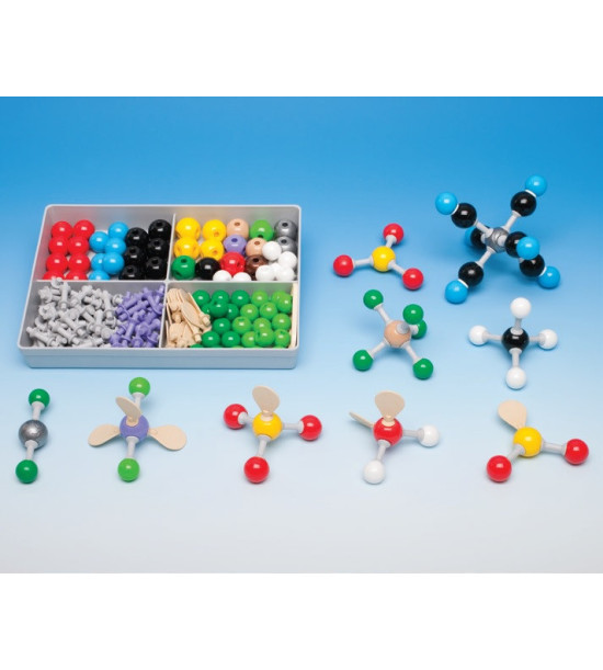 14 rôznych molekulárnych modelov podľa teórie VSEPR Valence Shell Electron Pair Repulsion (teória odpudzovania elektrónových párov valenčnej vrstvy, valenčné elektróny sa kvôli ich rovnakému náboju navzájom odpudzujú a preto nadobudnú tvar pri ktorom je toto vzájomné odpudzovanie čo najmenšie, čím sa teda mení aj celkový tvar molekuly). Tvary molekúl : lineárne (1), trigonálno-planárne (2), tetraédrické (4), trigonálno-bipyramidálne (4) a oktaédrické (3). Sada obsahuje atómy : šedé, 2 otvory, lineárne (napr. BeCl2); žlté, 3 otvory, trigonálne, (napr. SO3); čierne, 4 otvory, tetraédrické, (napr. CH4); žlté, 4 otvory, tetraédrické, (napr. SO3); červené, 4 otvory, tetraedrické, (napr. kyslík v H2O); svetlo zelené. 4 otvory, tetraedrické, (napr.fluór v HF); svetlo hnedé, 5 otvorov, trigonálny-bipyramidálne, (napr. fosfor v PCL5); žlté, 5 otvorov, trigonálny-bipyramidálne, (napr. síra v SF4); zelené, 5 otvorov, trigonálny-bipyramidálne, (napr. chlór v ClF3); purpurové: 5 otvorov, trigonálny-bipyramidálne, (napr. xenón v XeF2); šedé, 6 otvorov, oktaedrické, (napr. metalické komplexy); hnedé, 6 otvorov, oktaedrické, (napr.bróm v BrF5) ; medené, 6 otvorov, oktaedrické, (napr. medené komplexy). Väzby: 50 ks stredné (šedé, jednoduchá väzba), 15 ks stredné (purpurové, znázorňuje voľné páry), 6 ks krátke (biela).