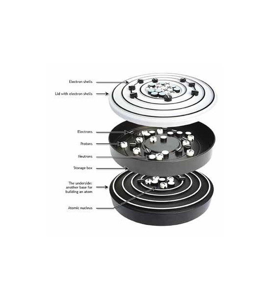 Interaktívny model atómu je vhodný na výučbu fyziky, chémie a biológie. Model obsahuje Box s vrchnákom; 4 elektrónové orbitály na vrchnáku a 4 na spodnej strane krabice: 2 atómy, 30 protónov, 30 neutrónov a 30 elektrónov. Pomocou modelu je možné stavať atómy, izotopy, ióny, konfigurácie vzácnych plynov, študovať štruktúru prvkov, kovalentné väzby, iónové väzby, prvky, atómovú hmotnosť, atómové čísla a periodickú tabuľku.