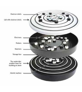 Obsah sady: Interaktívny model atómu učiteľský (2 atómové jadrá, 8 obežných dráh, 20 protónov, elektrónov a neutrónov) a 8 modelov atómu pre žiakov (každý s 2 atómami, 30 protónnmi, 30 neutrónmi a 30 elektrónmi), inštrukcie. Pomocou modelu je možné stavať atómy, izotopy, ióny, konfigurácie vzácnych plynov, študovať štruktúru prvkov, kovalentné väzby, iónové väzby, prvky, atómovú hmotnosť, atómové čísla a periodickú tabuľku.