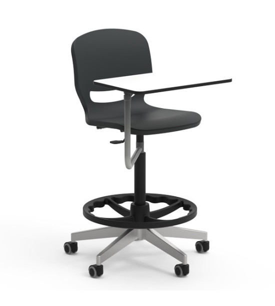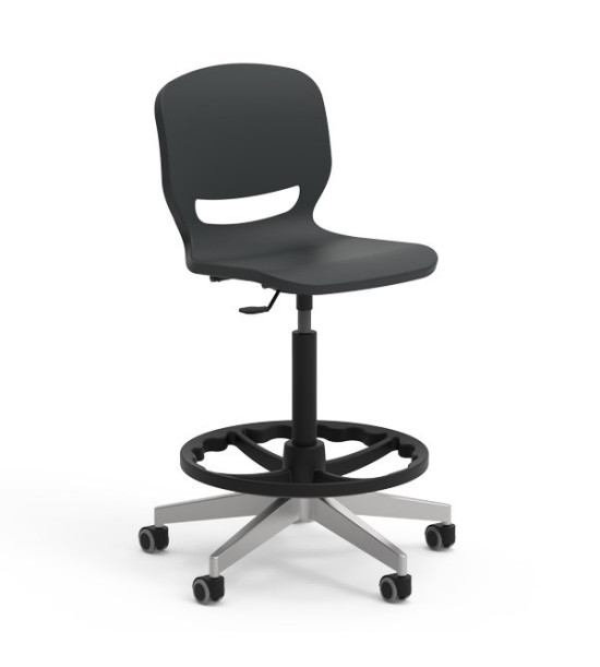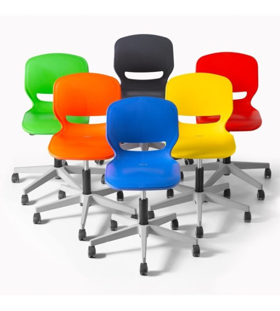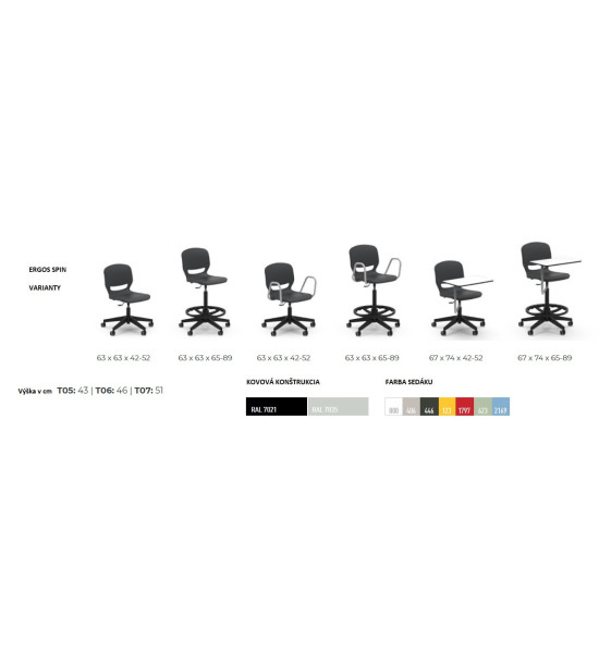 Učiteľská laboratórna stolička ERGOS SPIN, s oporou nôh, výškovonastaviteľná 65 – 89 cm. Stolička „SPIN“ s otočným rámom a výškovým nastavením, umožňuje nájsť ideálnu polohu a zabezpečiť správne a vyrovnané držanie tela, prináša množstvo výhod pre pohybový aparát a zlepšuje koncentráciu pri všetkých aktivitách. Sedadlo má 25 mm polypropylénovú škrupinu a výstuž po celom obvode pre väčšiu odolnosť a trvanlivosť. Operadlo stoličky má výrez, ktorý umožňuje „dýchanie“ pre väčšie pohodlie. Bedrová opierka znižuje únavu spôsobenú dlhým časom v sede. Široké sedadlo je bez hrán, zaoblený profil pre správny uhol ohybu kolena napomáha krvnému obehu. Stolička má vyššia odolnosť voči nárazom, poškriabaniu a opotrebovaniu. Nevyžaduje údržbu. Dizajn je bez priehlbín pre jednoduché a rýchle čistenie. Rozmery: 63.5 x 63 x 65 – 89 cm. Výškovo nastaviteľná stolička s 5 hliníkovými nohami s polyamidovými kolieskami. Stoličky „SPIN“ je možné doplniť o voliteľné príslušenstvo pridaním podrúčok, stolíka a čalúnenia sedáka. Voliteľné príslušenstvo nie je súčasťou základnej verzie, objednáva sa samostatne!