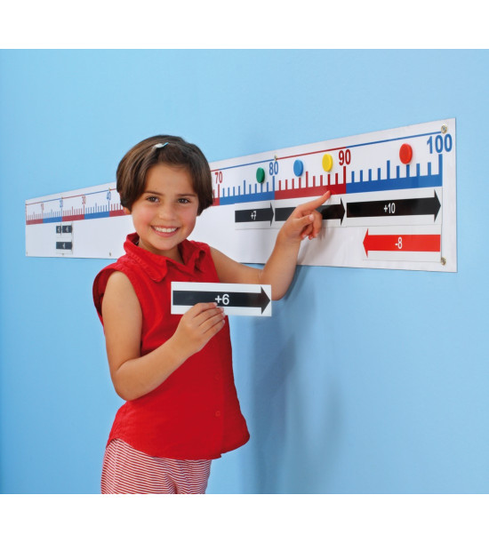 Široká a prehľadná magnetická číselná os, ktorá po pripevnení na stenu ponúka možnosť vizuálne stvárňovať aritmetické príklady a výpočty za pomoci magnetických šípok a krúžkov. Dieťa priamo sleduje výpočet a riešenie príkladu. Šípky s číslami sú vytlačené obojstranne na magnetickej páske. Červené šípky s číslami z jednej strany sú určené na odpočítanie a čierne šípky s číslami z opačnej strany na sčítanie. Na priame popisovanie číselného pásu využijete stierateľnú fixku.Obsah dodávky: - 1 magnetická číselná os / dĺžka 3m, - 39 magnetických obojstranných šípok s číslami, - 38 magnetov (30ks priemer 2cm, 8ks priemer 3cm), - opatrená otvormi na zavesenie, - skrutky sú súčasťou balenia.