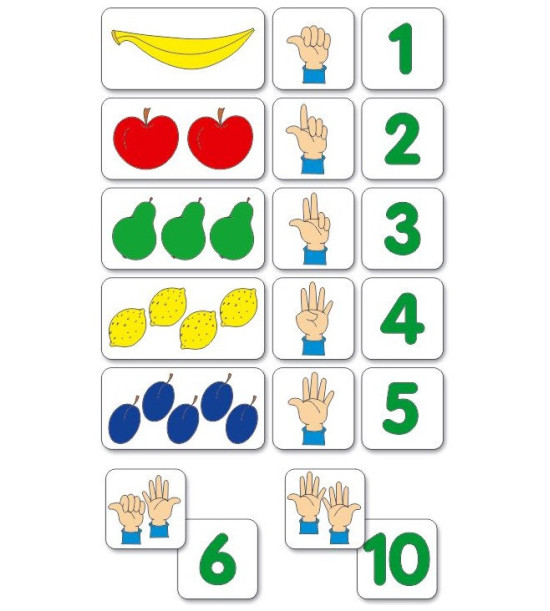 Pomôcka na vyvodenie čísel od 1 do 10. Sada farebných obrázkov pomáha deťom pri utvrdzovaní predstavy čísla od 1do 10 a vytváraní vzťahu medzi počtom prvkov a číselným alebo prstovým vyjadrením.Obsah: 20ks magnetické ilustrované obrázky / 9 x 9cm / pevný kartón 2mm 10ks magnetické ilustrované obrázky / 18 x 9cm / pevný kartón 2mm Kartónová krabica.