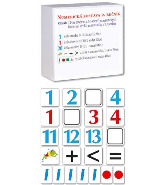 Učebná pomôcka na vyvodzovanie, každodenné precvičovanie a utvrdzovanie základného učiva matematiky v 2. ročníku. omôcka na opakovanie a vyvodzovanie základného učiva: - sčítanie a odčítanie v obore do 20 bez prechodu aj s prechodom cez základ 10 - určovanie daného počtu, počítanie po desať, po jednom - porovnávanie dvojciferných čísel znakmi - symbolika radovObsah: - čísla - modré 0 - 10 / 2 sady - čísla - červené 0 - 10 / 2 sada - čísla - modré 11 - 20 / 1 sada - znaky a znamienka / 1 sada - symbolika radov / 1 sada - bodková symbolika / 1 sada Spolu: 140ks magnetické karty / 9 x 9cm a 9 x 5,3cm / 2mm pevný kartón Dodávané v kartónovej krabici