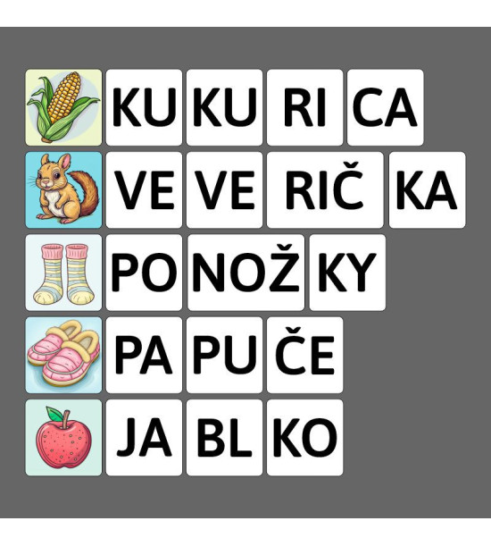 Cvičenie môže prebiehať rôznymi spôsobmi – učiteľ môže rozdeliť kartičky s obrázkami medzi deti a na spoločnú plochu rozložiť kartičky so slabikami. Deti potom postupne vyhľadávajú slabiky potrebné na zloženie názvu svojho obrázka. Alternatívne je možné pracovať iba s kartičkami so slabikami, kde deti vyberajú slabiky zo spoločnej kopy a samostatne skladajú zmysluplné slová.Tento set je ideálny pre predškolákov a mladších školákov, podporuje tímovú prácu, rozvoj jazykových schopností, čitateľskej gramotnosti a fonematického uvedomovania. Deti si zábavným spôsobom zdokonaľujú svoje schopnosti v čítaní a skladaní slov, čím získavajú sebadôveru v práci s jazykom.Obsah: 150ks kartičiek z 1.5mm lepenky Kartónová krabica.