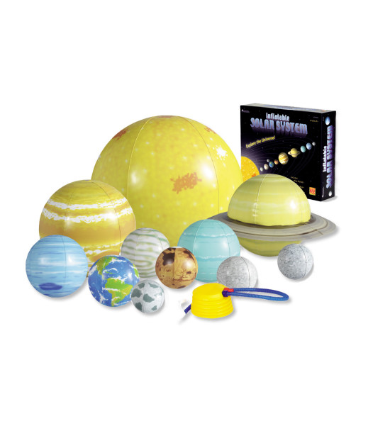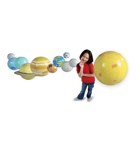 Pomocou nafukovacej slnečnej sústavy dokážete znázorniť rotáciu, otáčanie a obiehanie planét. Učí pozíciu, poradie, veľkosť a tvar planét a Slnka. Sada obsahuje 58 cm Slnko, 36 cm Jupiter, 28 cm Saturn (s prstencami), 23 cm Neptún, 23 cm Urán, 19 cm Venušu, 19 cm Zem, 15 cm Mars, 15 cm Merkur, 13 cm Pluto, 13 cm Mesiac, učiteľskú príručku, súpravu na opravu, nožnú pumpu. Môžete použiť ako predlohu na výtvarnej výchove. Vyrobené z odolného, umývateľného plastu. Vek 5+