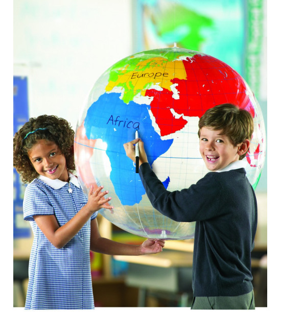 Obrovský nafukovací popisovací glóbus. Lokalizujte a označte kontinenty, povodia riek, krajiny, obchodné cesty a iné. Neobsahuje žiadne tlačené slovo. Obsahuje návod, sadu na opravu, háčik a šnúrku. Používajte zmývateľné fixy. Priemer glóbusu je 67,5 cm. Obsahuje malé časti, nevhodné pre deti do 3 rokov.