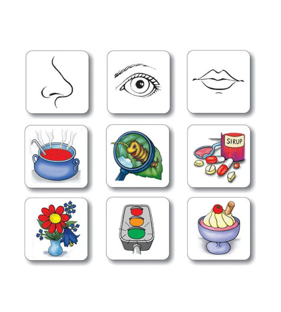 Súbor magnetických obrázkov pomáha motivovať deti k poznaniu a pomenovaniu zmyslov. Deti postupne triedia, rozlišujú a následne priraďujú obrázky k jednotlivým symbolom zmyslov.