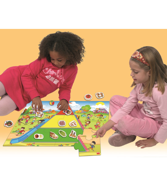 Hoďte kockou a podľa farby, ktorá vám padne doplňte do pyramídy jednu z nasledujúcich potravín: zelená ( potraviny, ktoré jeme často), žltá (niekedy), červená (príležitostne). Hra obsahuje 1 kocku, pyramídu puzzle veľkého formátu (66 x 45 cm), 45 kartičiek potravín, pedagogický návod a samokontrolný opravný systém.