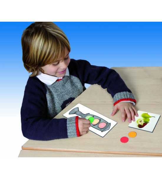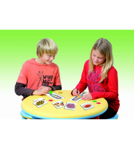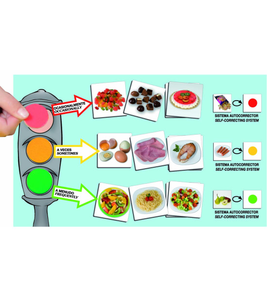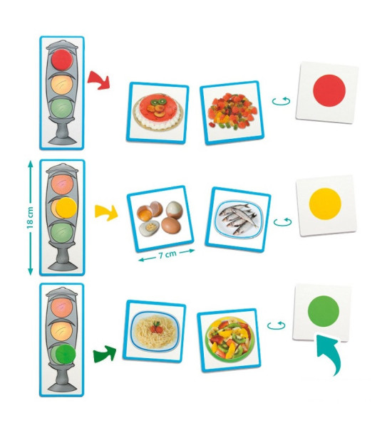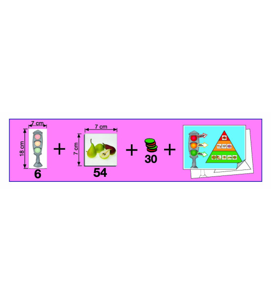Hra je zložená z 54 kartičiek základných potravín, ktoré sú označené podľa toho, ako často sa majú jesť: zelená ( potraviny, ktoré jeme často), žltá (niekedy), červená (príležitostne). Hra obsahuje 6 kariet s farbami semafóru, farebné žetóny, pedagogický návod.