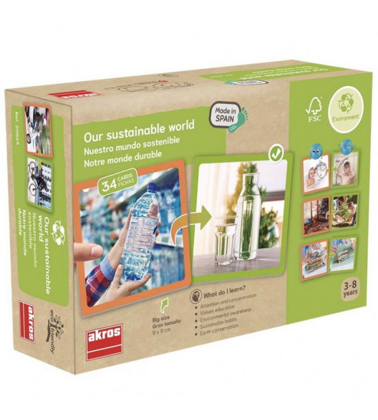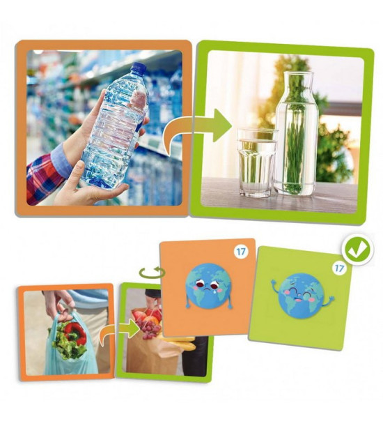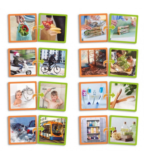 Obsah: 34 kartičiek 9x9cm s reálnymi fotografiami (17 párov). V každom páre je vždy jedna oranžová karta, ktorá ukazuje menej udržateľnú možnosť a jedna zelená karta, ktorá ukazuje udržateľnejšiu alternatívu. Úlohou hráčov je nájsť súvisiace dvojice a vysvetliť rozdiely medzi obrázkami.