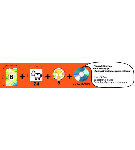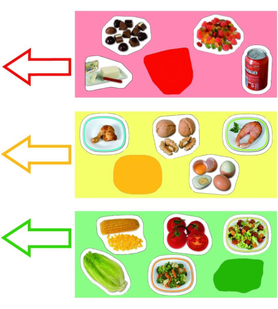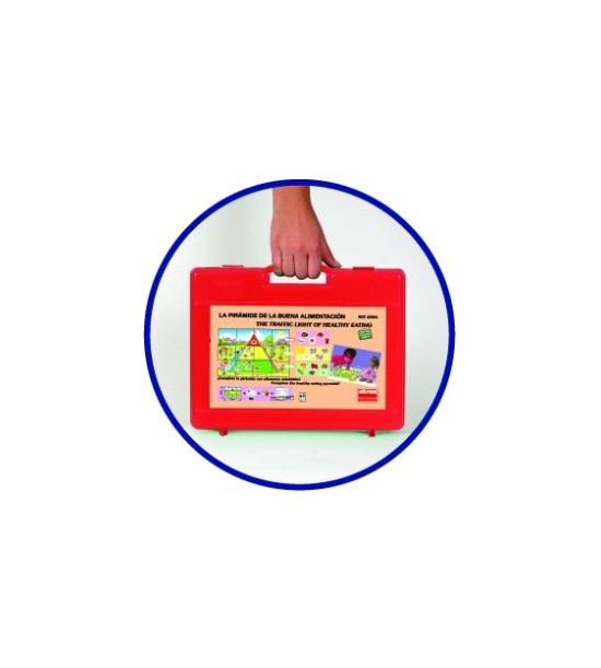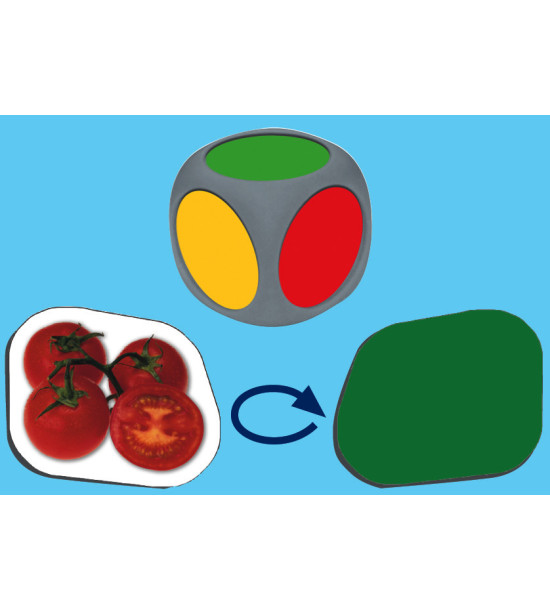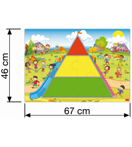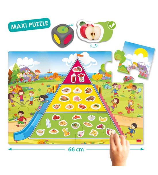 Hoďte kockou a podľa farby, ktorá vám padne doplňte do pyramídy jednu z nasledujúcich potravín: zelená ( potraviny, ktoré jeme často), žltá (niekedy), červená (príležitostne). Hra obsahuje 1 kocku, pyramídu puzzle veľkého formátu (66 x 45 cm), 45 kartičiek potravín, pedagogický návod a samokontrolný opravný systém.