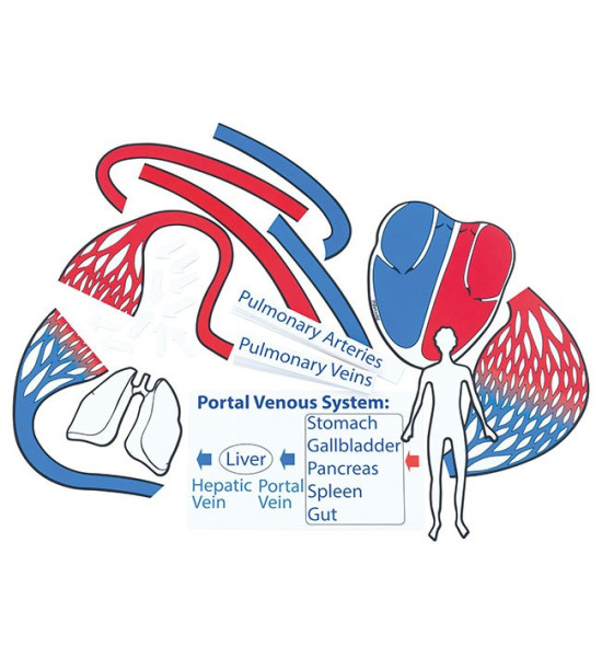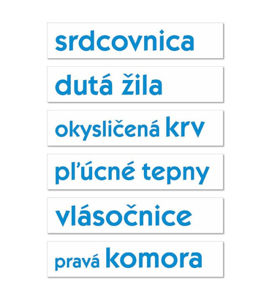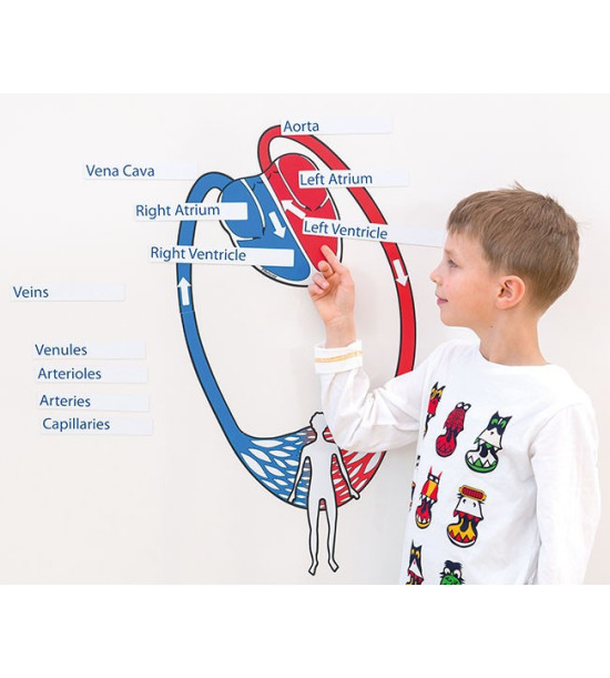 Praktická magnetická pomôcka rozdelená na jednotlivé časti umožňuje postupne krok za krokom vysvetliť krvný obeh. Deti vysvetľujú ako preteká krv, umiestnenie srdcových chlopní, čo sú tepny, žily, vlásočnice a i. Používaním samotného modelu preukazujú svoje vedomosti. Vďaka textovým kartám si rozvíjajú slovnú zásobu.Obsah: 18ks obehový systém / 77 x 35cm 15ks textové karty s názvami / slovenčina 15ks textové karty s názvami / angličtina - nemčina Balené v kartónovej krabici.