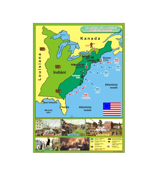 Územie 13 pôvodných kolónií, pripojenie územia do r. 1783, smery osídlenia, význ. udalosti, intervencia britskej armády, franc. pomoc, významné bitky. Nástenná mapa 120 x 90 cm, lišty. Materiál: silná biela fólia vnútri vystužená tkaninou. Prílohou pomôcky je CD, ktoré obsahuje danú mapu s legendou a pracovný list (čiernobielu kópiu). Ten je možné podľa potreby vytlačiť a využit ako námet k opakovaniu alebo doplneniu poznámok žiakov a študentov.