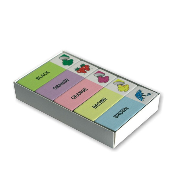 Dominový rýchlotest / AJ Farby - obsahuje v jednom balení 5 samostatných sád. Každá sada má svoju farbu a obsahuje 10 kartičiek so slovnou zásobou z daného okruhu. Spolu 50 precvičení slovíčiek. Ďalší variant klasickej pomôcky v novom atraktívnom šate. Potrebujete zamestnať neposedných žiakov, hravou formou utvrdiť alebo rýchlo preskúšať znalosti učiva? Dominový rýchlotest obsahuje v jednom balení 5 samostatných sád. Súčasne počítajú piati žiaci alebo päť skupín. Každá sada má svoju farbu. Obsahuje 10 kartičiek so slovnou zásobou z daného okruhu. Pri správnom zložení všetkých kartičiek musí obrázok na poslednej nadväzovať na slovíčko prvej.Obsah: 5 sád po 10 kartičiek / 7,5 x 2,5cm - kartička / 2mm laminovaný kartón Balené v kartónovej krabičke.