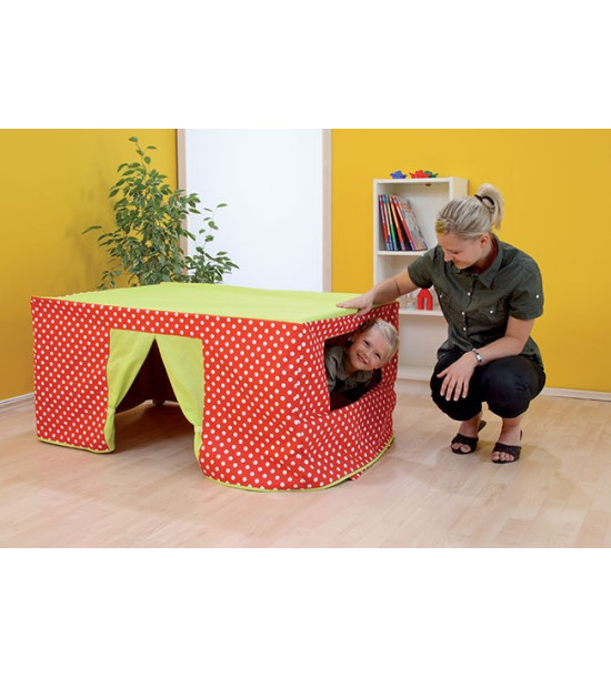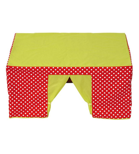 Vytvorte si tento krásny domček pre veselú zábavu detí. Závesy na dvierkach a 2 oknách sa otvárajú a zatvárajú suchým zipsom. Stolový stan sa hodí na všetky stoly s rozmermi 120 x 80 cm, výška 52 cm. Vyrobené z pevnej látky s vizuálne zaujímavým bodkovaným vzorom. Obsah: 1ks stolový stan / 120 x 80 x 52cm