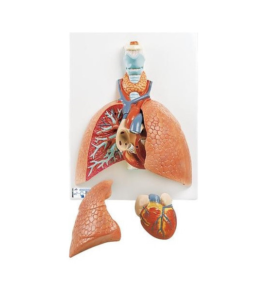 Model obsahuje časti hrtana, priedušnicu s prieduškami, 2 -dielne srdce (podkľúčna tepna a žila, dutá žila, aorta - srdcovnica, pľúcnica), pažerák, 2-dielne pľúca, dutá žila, bránica (predné časti sú odnímateľné). Na stojane. Rozmery: 31x41x12 cm.