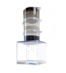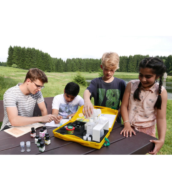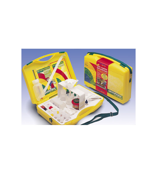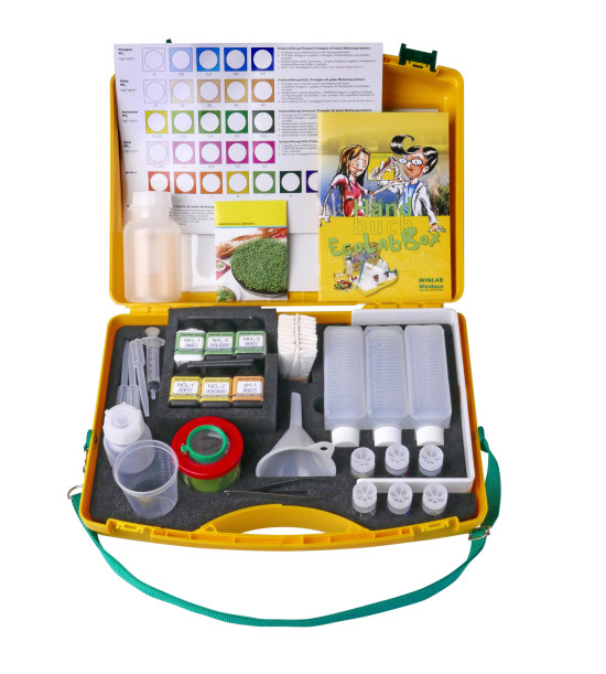 Malé, prenosné laboratórium, pomocou ktorého môžete priamo v teréne vykonávať rozbor vody a pôdy alebo vyskúšať 45 jednoduchých experimentov. Vďaka tomuto laboratóriu je možné zisťovať a merať vlastnosti najdôležitejších látok, ktoré ovplyvňujú naše životné prostredie. Obal kufríka je pevný, vodotesný a veľmi jednoducho sa čistí. Kufrík a jeho vnútorná časť sú vyrobené zo 100% recyklovateľného polypropylénu. Vďaka nastaviteľnému popruhu na rameno sa kufrík ľahko prenáša, napríklad aj na bicykli. Je vhodný pre žiakov nad 10 rokov. Obsahuje: 80 stranový návod na použitie s farebnými ilustráciami a tabuľkami (v nemeckom jazyku) a preložený návod s podrobnými vysvetleniami v slovenskom jazyku, sadu s roztokmi na 59 experimentov od pH 3 do pH 9; amónium 0,05 – 10mg/l; dusitan 0,02 – 1,0mg/l; dusičnan 10 – 80mg/l; fosfát 0,5 – 6mg/l, extrakčné tekutiny na analýzu pôdy, experimenty s dusičnanom, fosfátom a amóniom, kartu s farbami na porovnanie nameraných hodnôt, filtračnú trojnožku, môže byť priamo postavená v kufríku, vreckové zväčšovacie sklíčko s 2- a 4-násobným zväčšením, špeciálny štetec na mikroorganizmy, vodeodolnú podložku na biologické experimenty, pomôcky ako sklíčka na vzorky, filtračný papier, laboratórne fľaše so širokým otvorom a kadičky, DIN plagáty veľkosti A2 na zapisovanie výsledkov meraní a ďalšie vysvetľujúce obrázky.
