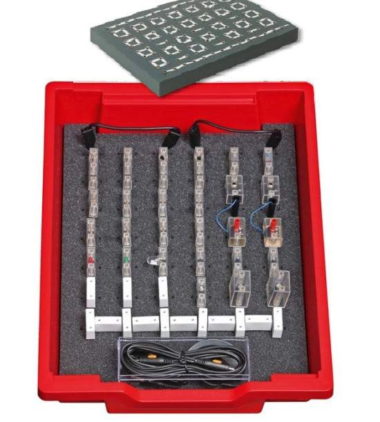 Súprava obsahuje vybavenie potrebné na experimentovanie s funkciou a správaním elektronických súčiastok a obvodov. Všetky komponenty sú prehľadne umiestnené v robustnom plastovom boxe. V súprave nájdete aj zásuvnú dosku na prepájanie elektrických obvodov. Témy pokusov: Dióda a usmerňovač; LED; Rozdeľovač napätia; Mostíkový okruh; Termistory; Fotorezistor; Tranzistor / spínač, zosilňovač, variabilný odpor; Vysielač; Kolektor; Fotoelektrické riadenie; Svetelná bariéra; Spínač Twilight; Spínač s oneskorením; Regulácia teploty pomocou termistorov; Monitor teploty; Blikač; Schmittova spúšť; Spínač vlhkosti / sucha; Diferenciálny zosilňovač; Klopné obvody AND / OR / NAND; Elektronický multivibrátor; FET tranzistor; Optoelektronika pomocou tranzistorov FET; Preklápací obvod pomocou tranzistorov FET; Používanie svetla na prenos hudby, vysielač a prijímač.