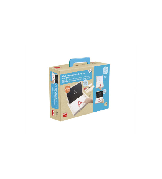 Malé pieskovisko s tabuľou. Podporuje písanie, kreslenie, hranie s valčekmi, a pod. Pieskovisko má priehľadné dno, ktoré umožňuje podloženie farebného pozadia na zvýšenie efektivity práce. • rozm. dreveného podnosu 30 x 23 x 4 cm • obojstranná tabuľa - čierna (krieda) a biela (popis fixkou) • 3 kriedy • 1 stieracia hubka • 1 fixka • 1 vrecko s pieskom 0,4kg