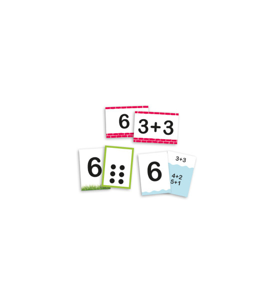 Didaktická hra rozvíja matematické myslenie v oblasti do 10. Nabáda deti, aby sa intuitívne naučili základné matematické operácie.Obsah: 62 obojstranných kartičiek (12,4 x 8,75 cm).