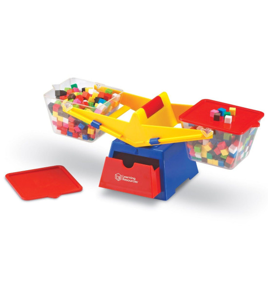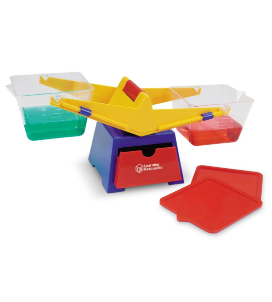 Váha s odmerkou. Môžete vážiť alebo merať kvapaliny a tuhé predmety, odhadovať, porovnávať a rozlišovať ich. V základni sa nachádza zásuvka a obsahuje 2 odnímateľné 400ml odmerky. Materiál: plast. Rozmery: 42cm Š x 16,5cm V. Vek 3+