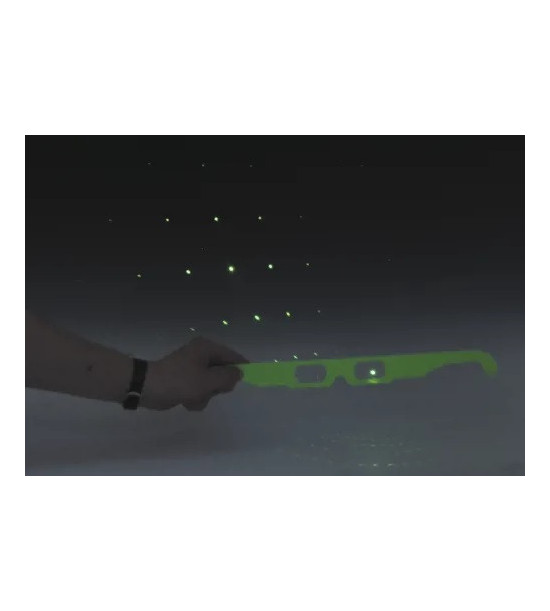 Difrakčné okuliare, v balení je 10ks okuliarov. Pozrite sa na svet novými očami! S týmito okuliarmi pozostávajúcimi z dvojrozmernej optickej mriežky (195 čiar/mm) je všetko farebnejšie. Ideálne na použitie v triede na demonštráciu spektrálnych trubíc a farebného spektra svetla.