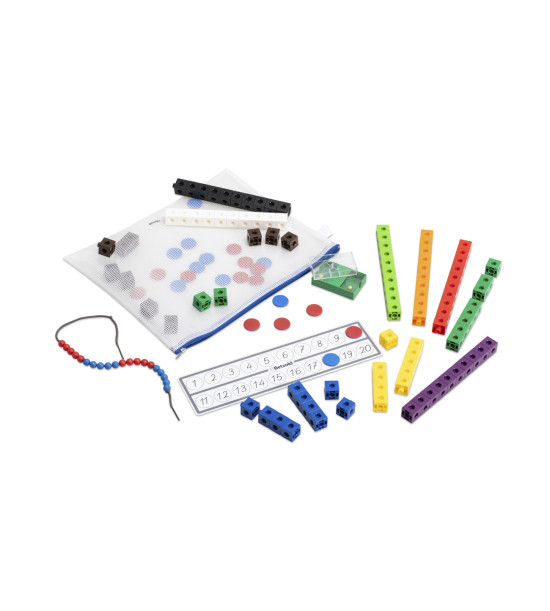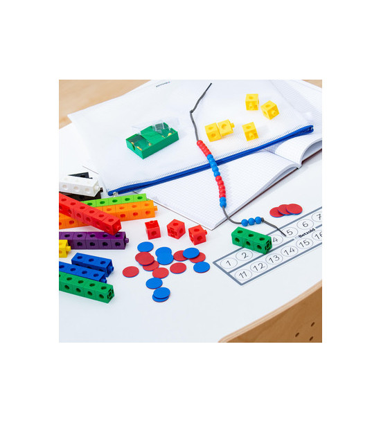 Táto súprava v praktickom vrecúšku na zips obsahuje všetko, čo malí školáci potrebujú na precvičovanie počítania do 20. V priesvitnej taške so zipsom sa nič nestratí. N aprvý pohľad uvidíte, čo je vo vnútri. Obsah: 100 ks spájateľných kociek s hranou 2 cm. Kocky možno použiť na znázornenie lineárnych princípov počítania. Vďaka tomu je veľmi jednoduché porovnávať množstvá, triediť, sčítať a odčítať. Šnúrka s 20 farebnými korálkami Obojstranné pravítko s 20 políčkami a 22 farebných žetónov Multi-Split box
