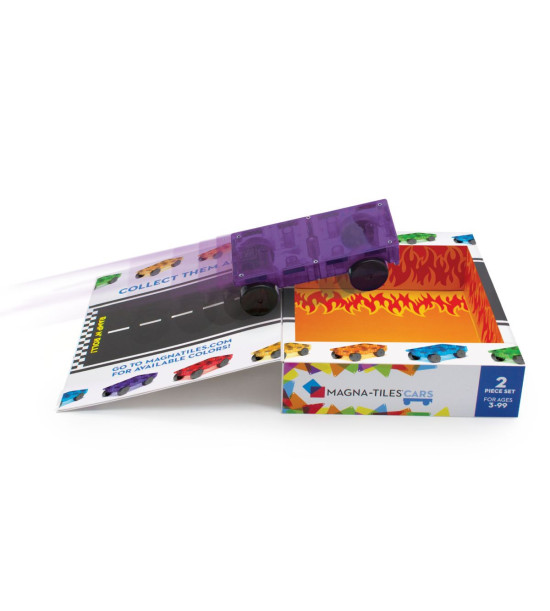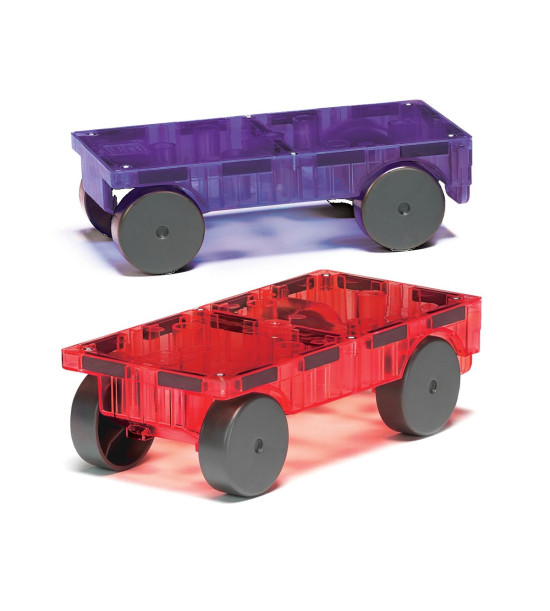 Magna-Tiles je zástancom zmysluplnej hry, to znamená zábavnej a pútavej, no zároveň založenej na rozvíjaní detských zručností. Táto stavebnica podporuje rozvoj koordinácie ruka-oko, jemnej motoriky a logického myslenia prostredníctvom skúmania príčin a následkov. Bezpečnosť a špičková kvalita sú zaistené použitím potravinárskeho, netoxického plastu MABS bez BPA, ftalátov a latexu. Pevná konštrukcia dielikov zabraňuje praskaniu a udržiava magnety bezpečne na svojom mieste. Sada obsahuje: 1x fialový podvozok s kolesami, 1x červený podvozok s kolesami. Rozmery: 19.05cm X 8.89cm X 25.4cm