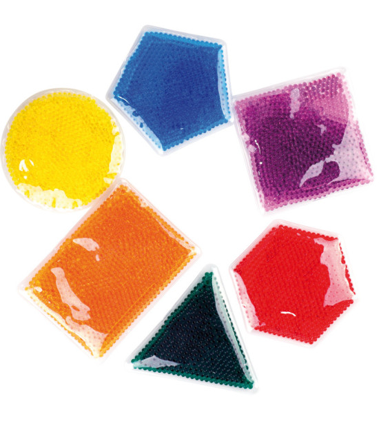 Deti sú fascinované tým, ako sa gélové guľôčky v geo tvaroch pohybujú pri tlaku. Na svetelnom stolíku to vyzerá obzvlášť efektne, keď niekoľko predmetov leží na sebe a farby priesvitných výplní sa tlakom prstov miešajú. Rozmery: hrúbka vankúšikov 1,7cm, výška tvarov cca 16cm, priemer kruhu 15,5cm.