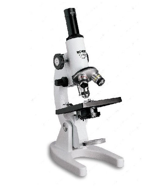 Študentský biologický mikroskop s kovovým telom a sklenenými achromatickými šošovkami. Zväčšenie do 600x. Biologický mikroskop s monokulárnou hlavou, 15xWF okulárom a tromi výmennými achromatickými objektívmi: 4x, 10x, 40x. Dvojitá zameriavacia regulácia, mikro a makrometrický, vysúvací držiak, clony s filtrom, kryt proti prachu.