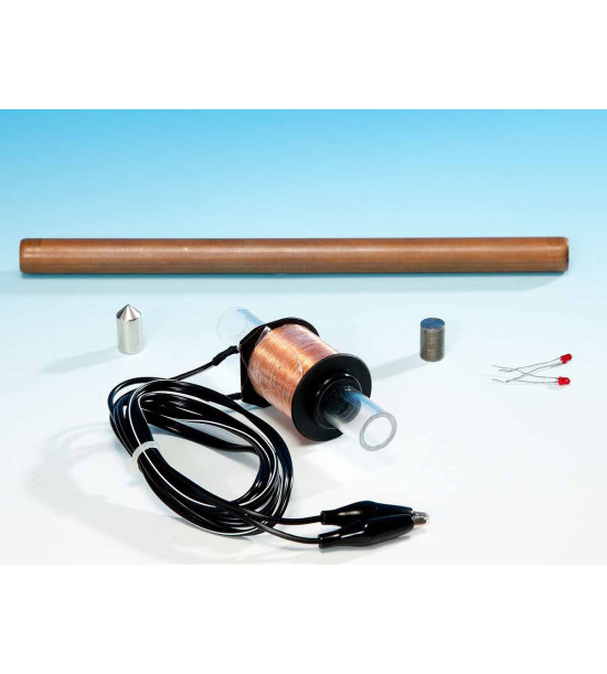 Pohyb magnetu cievkou indukuje prúd a rozsvieti LED. Demonštrácia vytvárania vírivých prúdov v trubici. Magnet spustený cez medenú trubicu padá pomalšie, ako keď je spustený mimo trubice, alebo v porovnaní s nemagnetickým valčekom. Možnosť aplikácie Flemingovo pravidlo pravej ruky v praxi a konverzie energie. Vhodné pre školy od 3.stupňa. Podržte medenú trubicu nad pevným povrchom a spustite do nej kovový valček. Potom spustite dolu cez trubicu magnet rovnakej veľkosti - pád bude trvať asi 8-krát dlhšie. Čo sa deje? Pohyb magnetu vytvára v medenej trubici elektrický prúd. Prúd v trubici sa nazýva vírivý prúd. Tento jav objavil Michael Faraday. Vírivý prúd v trubici generuje svoje vlastné magnetické pole, ktoré pôsobí proti magnetickému poľu magnetu, čo spôsobuje, že cez trubica padá pomalšie. V roku 1834 ruský fyzik Heinrich Lenz objavil tento vzťah medzi indukovanými magnetickými poľami a prúdom, ktorý je známy ako Lenzov zákon. Týka sa to premeny energie použitej na elektromagnetickú indukciu. Kam ide energia? V tomto príklade sa energia padajúceho magnetu premení na elektrický prúd, ktorý sa potom rozptýli ako slabé teplo v medenej trubici. Ak má medená trubica tenšie steny, preteká ňou menej prúdu, a preto sa mení menej energie a magnet stráca menej z rýchlosti.